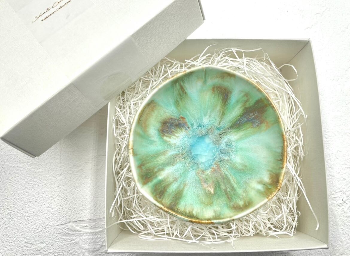 size:Φ11cm×H5cm フレッシュなグリーンの中に溜まる釉薬が美しい中鉢です。 窯の中でゆっくりと生まれる結晶は、一つとして同じものがなく、それぞれ異なる表情を持っています。 少し小ぶりで深さのあるフォルムは、料理をやさしく受け止め、盛り付けに自然な余白を生み出します。 花を生けたり、そのままオブジェのように飾って楽しむこともできます。 普段使いにも、少し特別な一皿にもおすすめの器です。 ※食洗機の使用はお控えください。